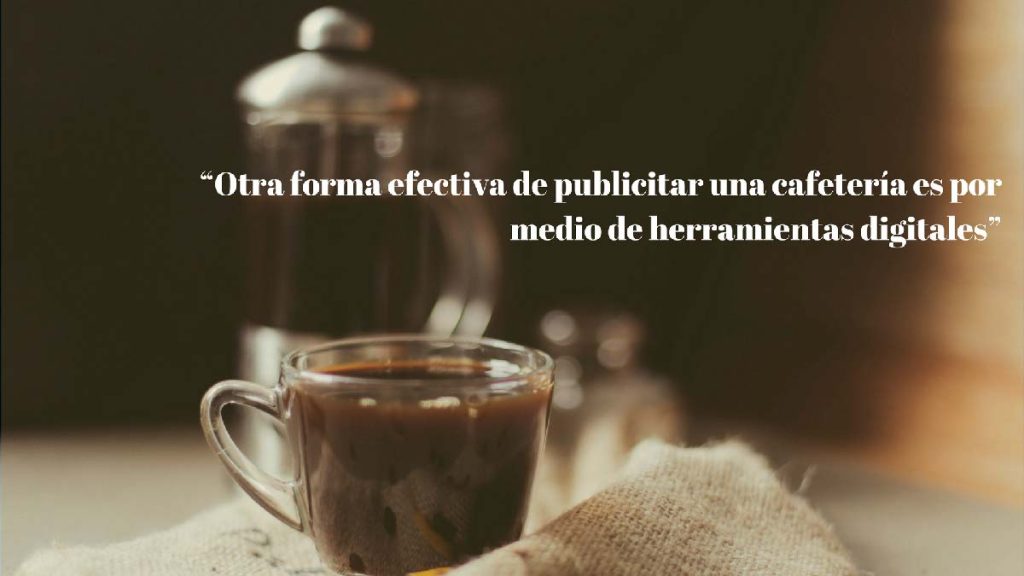 Otra forma efectiva de publicitar una cafetería es por medio de herramientas digitales: mediante un sitio web o, como ya lo mencionamos, redes sociales como Facebook, Twitter o Instagram. Existen desarrolladores web a los que puedes acudir para que realicen tu página en internet y posicionar tu marca de cafetería. La ventaja de lo digital es que puedes abarcar más público y de hecho es mucho más económico que la promoción tradicional (volantes y anuncios de radio).